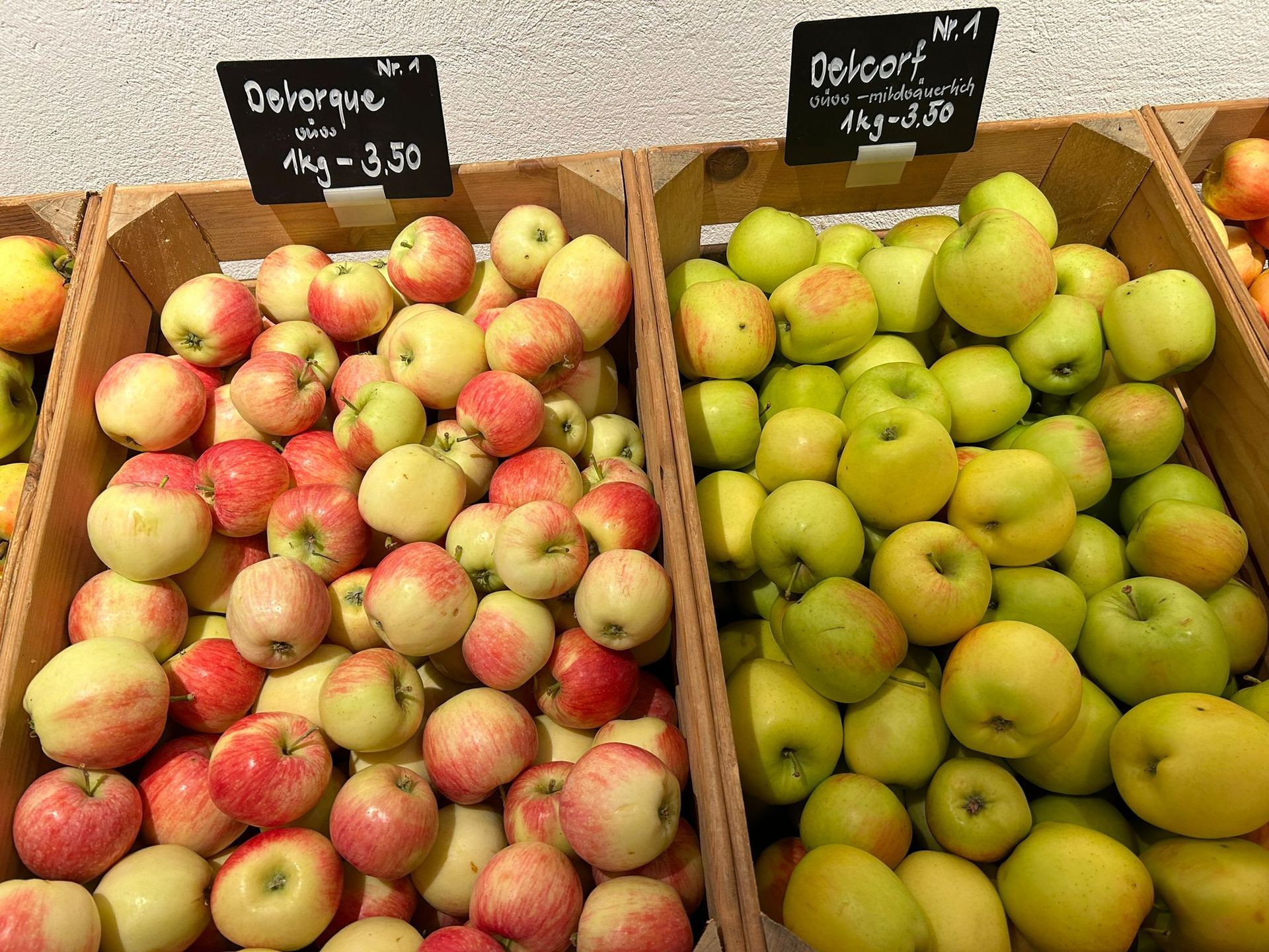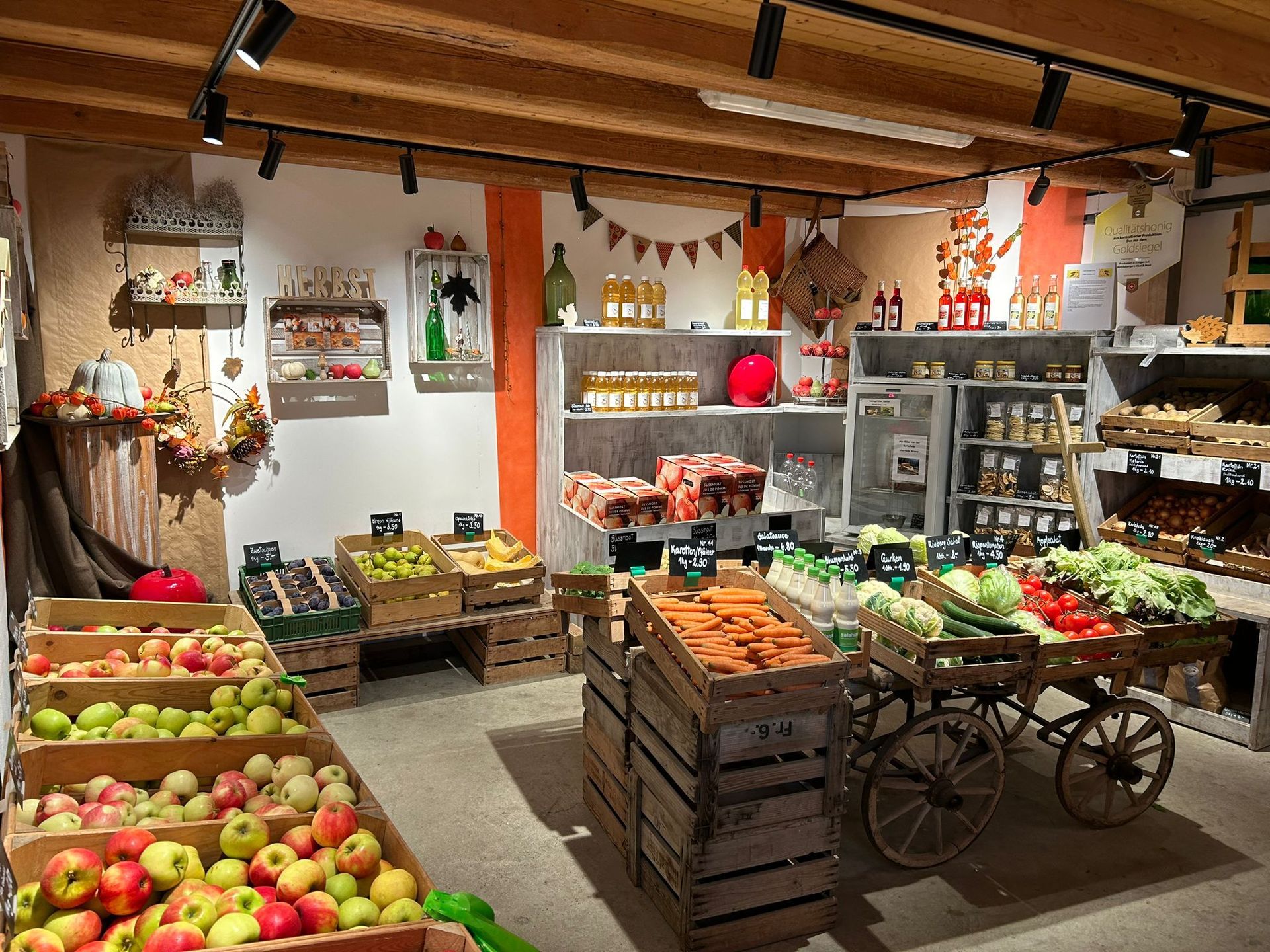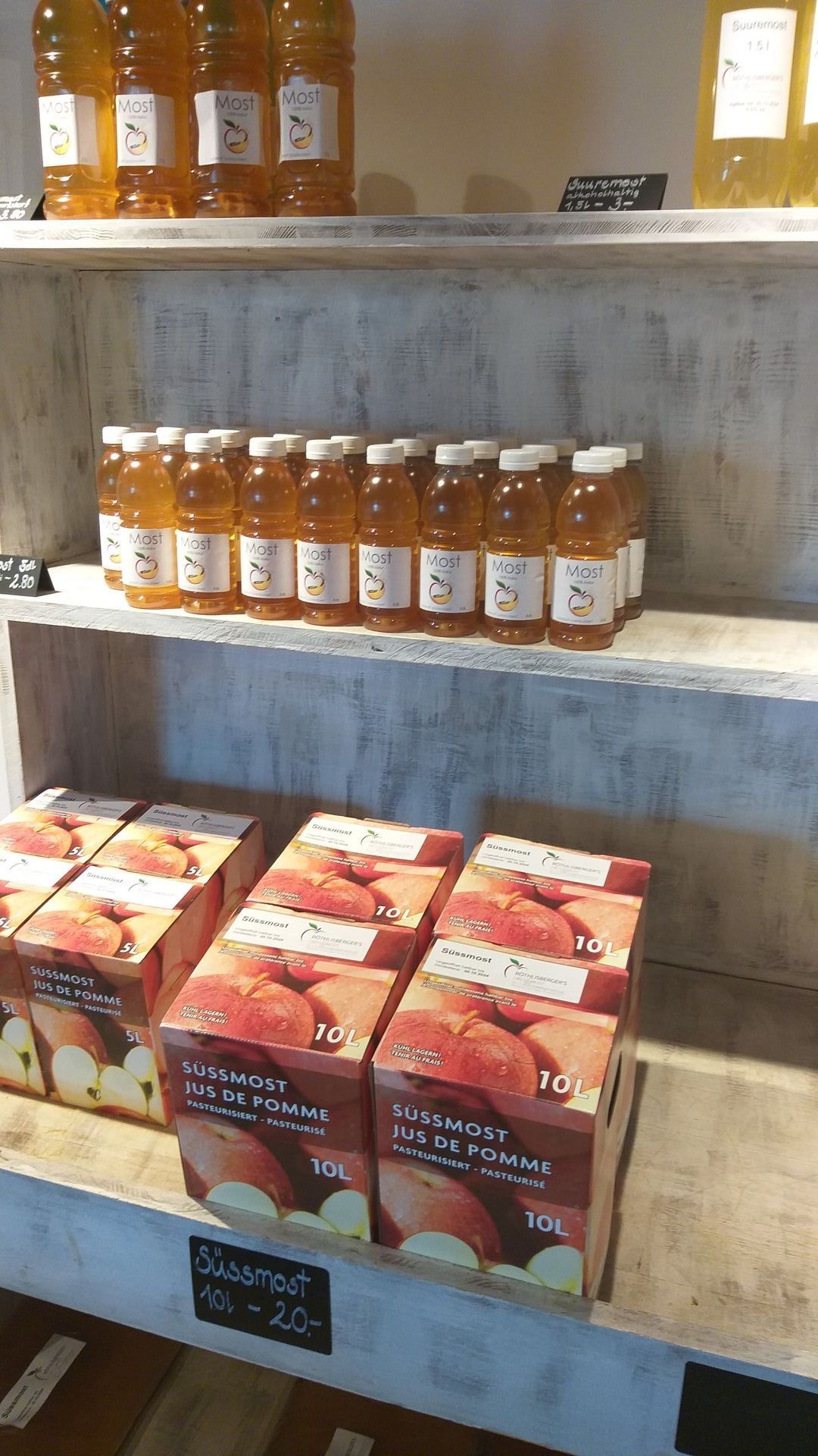 Neben Aepfeln. Kartoffeln und Eier finden Sie auch Süssmost, Sirup. Apfelringli oder Honig .